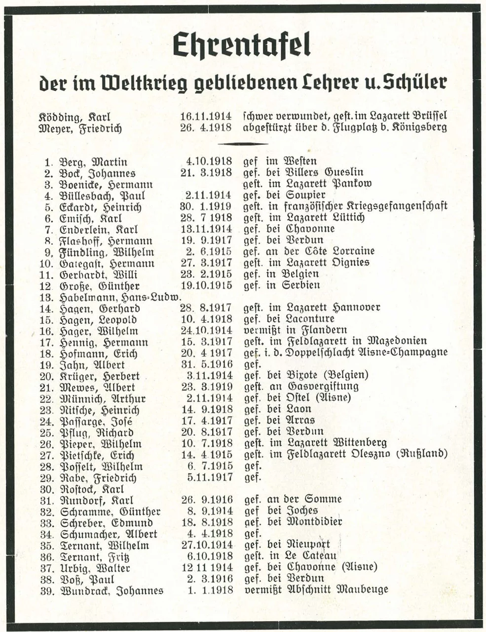 Eine Gedenktafel im Schulgebäude erinnerte an zwei gefallene Lehrer und 14 Schüler, wohl wissend, dass diese Liste unvollständig war und die tatsächliche Zahl der Gefallenen deutlich höher lag. Die Beschränkung auf die Schüler der oberen Klassenstufen macht deutlich, dass ein Großteil der Opfer nicht erfasst wurde. Gedenktafeln dieser Art waren ein fester Bestandteil der Nachkriegs- und Zwischenkriegszeit in deutschen Schulen; sie dienten der Heroisierung des Kriegsopfers und trugen zur Stabilisierung nationaler Deutungsmuster bei. Diese Praxis der schulischen Helden- und Opfergedächtnisse spiegelt die nationale Deutung des Krieges in der Zwischenkriegszeit wider, bei der Schulen als Träger kollektiver Erinnerung fungierten. Die Jahre 1914 bis 1918 zeigen exemplarisch, wie sehr Schule in dieser Epoche Teil der nationalen Kriegsanstrengung wurde. Sie war nicht nur Bildungsinstitution, sondern soziales Mobilisierungsinstrument. Die kontinuierlichen Notreifeprüfungen, die Heranziehung auch Minderjähriger zu Kriegsdiensten, der Einsatz von Lehrkräften und Schülern im Hilfsdienst sowie die dauerhaften Einschränkungen des Unterrichts dokumentieren, wie stark militärische und politische Ziele die schulische Praxis bestimmten.